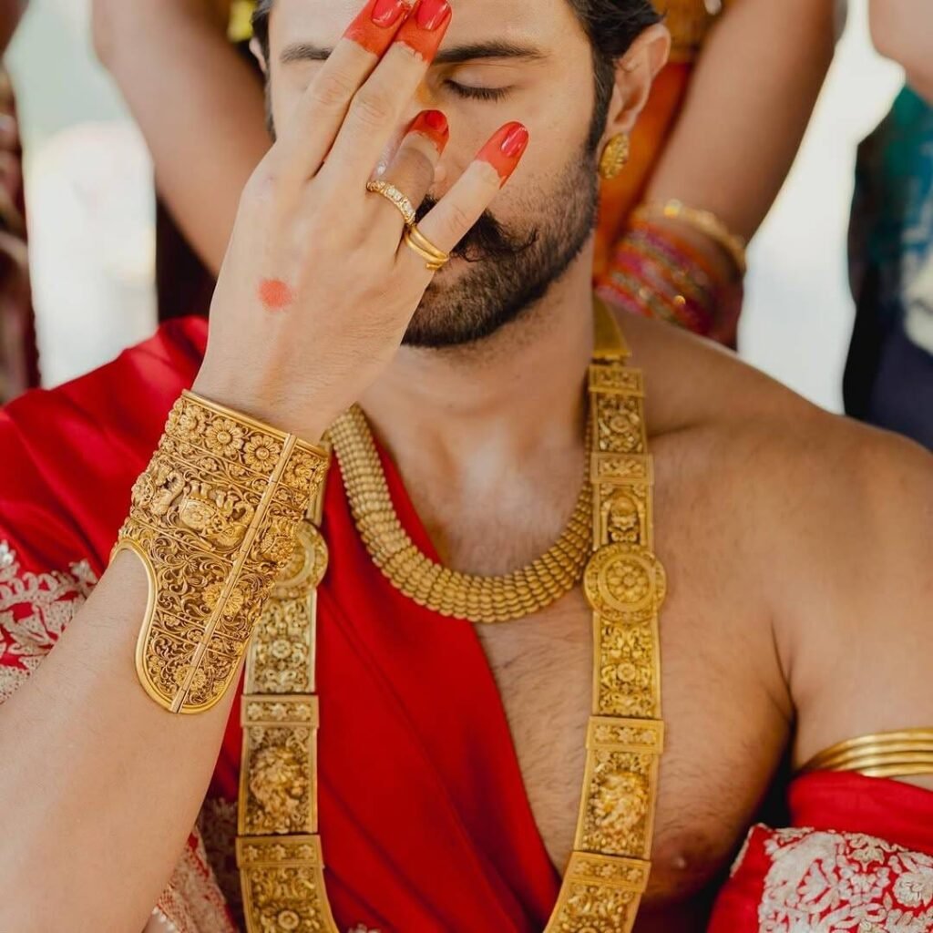 हातावर आल्ता, भरजरी दागिने, कमरपट्टा, बाजूबंद.. अशा अत्यंत पारंपरिक अंदाजात विजय दिसून आला. त्याने धोती आणि त्यावर शॉल परिधान केला होता. दाक्षिणात्य वर म्हणून विजय अत्यंत सुंदर दिसत होता, अशा प्रतिक्रिया नेटकऱ्यांनी दिल्या आहेत.